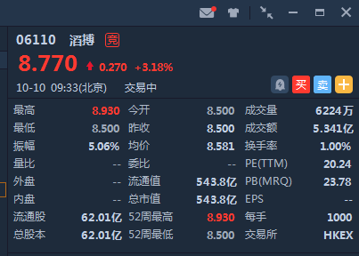 滔搏首日挂牌,截至9时34分,涨3.18%,报价8.77港元 ,成交额5.341亿港元 ,最新市值543.8亿港元。