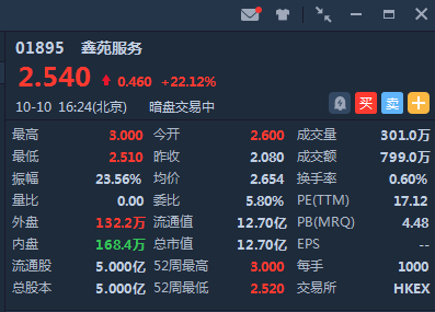 鑫苑服务暗盘高开25% ,截止16:25,暗盘段报2.54港元,较发行价2.08港元涨22.12%,暂成交799万港元,最新总市值12.70亿港元。