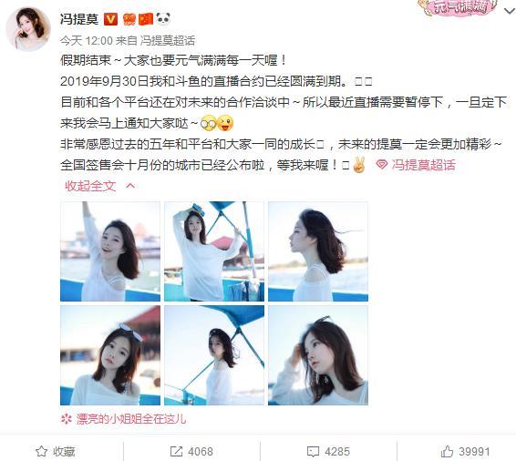10月8日,“斗鱼一姐”冯提莫在微博上宣布与斗鱼的合约到期,这一消息出来后迅速登上了热搜。