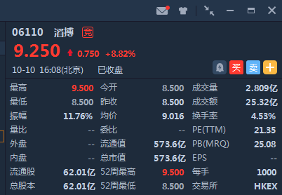 滔搏首日挂牌港交所,截止收盘涨8.82%,报价8.25港元,若以发行价8.50港元买入,一手赚750港元,成交额25.32亿港元,市值达573.6亿港元。