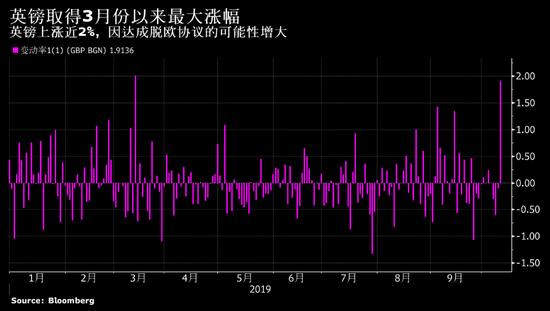 “这种急剧反弹似乎证实了英镑存在投机性空头,这些头寸在尾盘匆匆解除,”Union Bancaire Privee策略师Koon Chow表示。“尽管联合声明没有太多细节,但它增强了我们的期望,即本月底将有延期而不是无协议脱欧。但仍有选举风险,因此英镑回升还是有些障碍。”