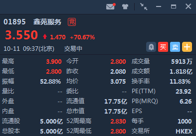 鑫苑服务今日在港上市,股价高开34.62%,截止09:37报3.55港元,涨70.67%,市值17.75亿港元。
