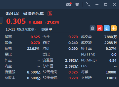 傲迪玛汽车今日在港上市,股价高开12.5%,截止09:37报0.305港元,涨27.08%,市值2.592亿港元。