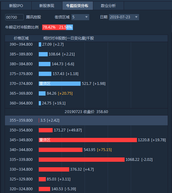 其中在牛证分布中,重货区位于345-349.8元,代表着大部分的投资者所选择的牛证,收回价都聚集在此,也可以理解为,他们预期这个价格区间,将是短期腾讯股价的一个有力支持位。