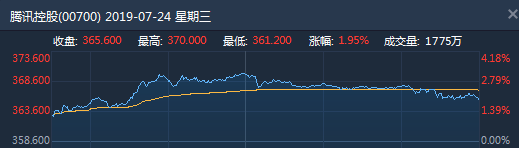 那么腾讯第二天到底表现如何呢?查看行情图可以发现,腾讯第二天涨了1.95%,全天最低位在361.2港币,看来,群众的眼光确实有雪亮的时候。