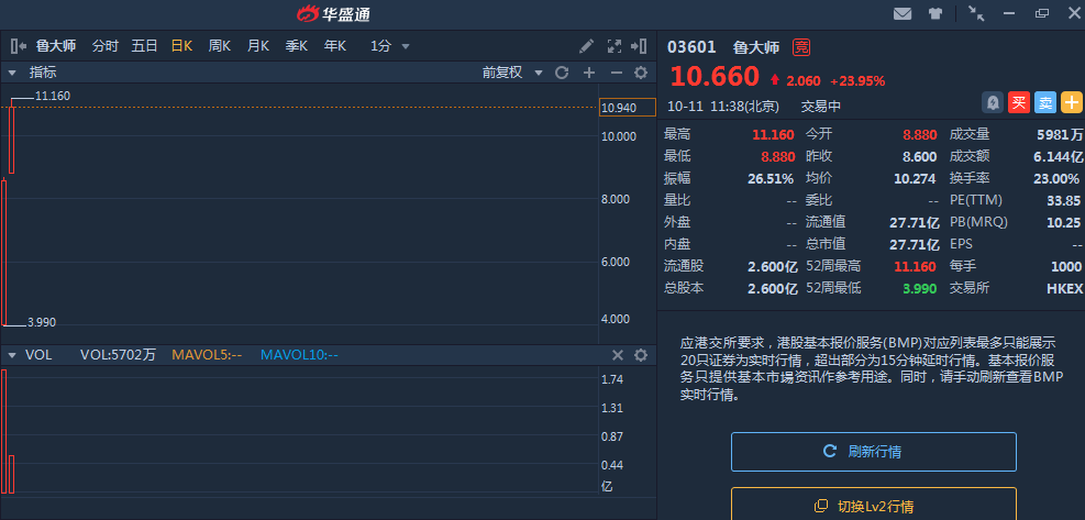 实际上在前一天的暗盘表现就可以看到其强势的苗头。在10月9日,鲁大师暗盘收涨38.89%,以每手一千股计算,中签的投资者可获利1050港元。不过鲁大师的一手中签率仅为20%,意味着这部分利润还是需要运气。但是如果你在暗盘买进仍然能吃到大肉,鲁大师上市首日高开近50%,随后涨幅一路扩大至收盘的218%。按照鲁大师发行价2.7港元来算,每手可净赚5900港元。到了10月11日,鲁大师仍然保持强势,截止发稿涨幅近24%,每手可赚7960港元!