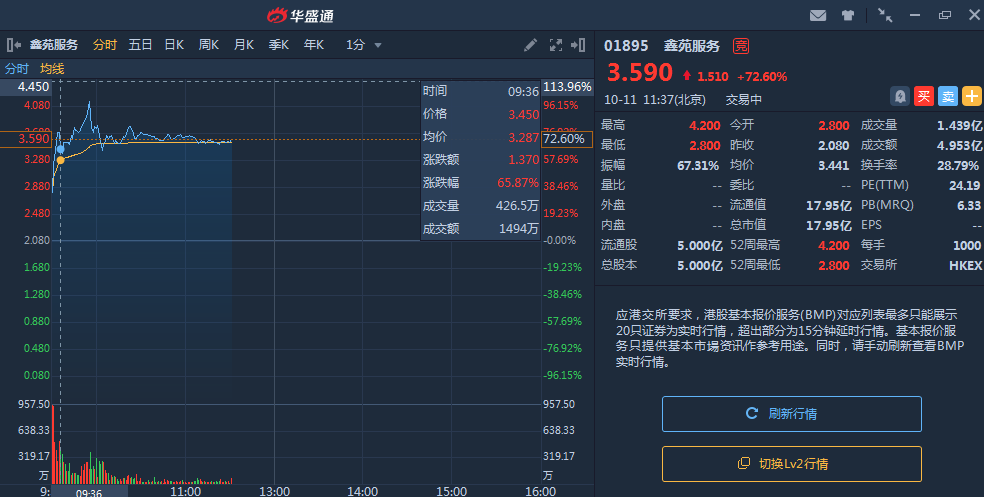 而10月11日,港股市场又迎来一只首日高开高走的新股,那就是鑫苑服务。鑫苑的走势延续了鲁大师的强势,股价开盘涨幅在34.62%,之后接近快速拉升,一度涨幅超过90%。如果按照发行价2.08港元来算,每手相当于赚到1900港元,今天鑫苑服务收盘会涨收多少值得期待!在前一天,鑫苑的暗盘表现也很不错,收涨于12.98%。