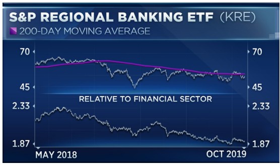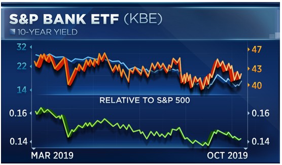 Gordon说,在2019年的大部分时间里,债券(与收益率成反比)在收益率下降的同时不断攀升,损害了这些金融股的盈利潜力,并加剧了金融股表现逊于标普500指数的状况。他说,但是,现在他看到了希望,KBE相比标普指数的表现开始走强。