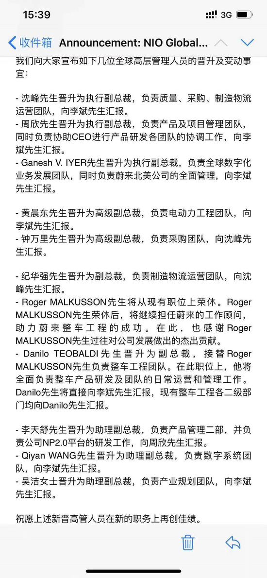 人事变动邮件中,Roger Malkusson荣休。Roger Malkusson在蔚来主要负责整车工程项目,在萨博(SAAB)的14年中,他始终专注于车辆安全性能的研究。此后,他又在通用、泛亚负责整车研发,至今他领导研发并发布的车型超过三十款。