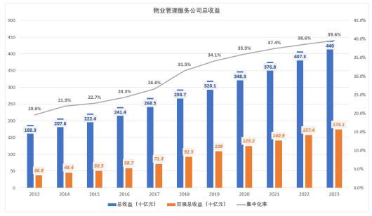 根据数据显示,未来物业管理服务百强公司会保持稳定的增长率。据弗若斯特沙利文数据,到2023年,中国物业管理服务公司的总收益预计将达人民币4400亿元,从2018年至2023年的预期复合年增长率为8.4%。而物业服务百强企业的总收益预计达1741亿。