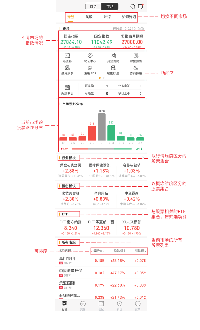 首先是不同市场的切换,页面上方会有港股、美股、沪深和沪深港通的区域,针对我们自己的信息倾向进行点击即可切换,切换后下方会同步相应的市场指数供我们参考。