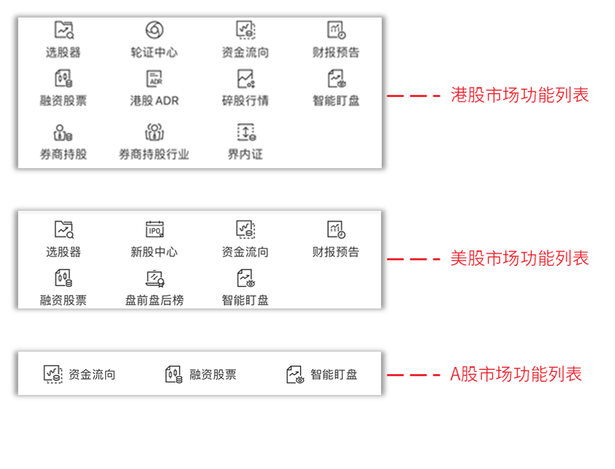 第二,华盛通针对不同市场的特点,开发了不同的功能服务投资者,点击每一个功能就能进入详细页面做下一步操作,比如港股的碎股行情(需要港股LV2高级行情)、美股的盘前盘后榜(需要美股LV1高级行情)等等。