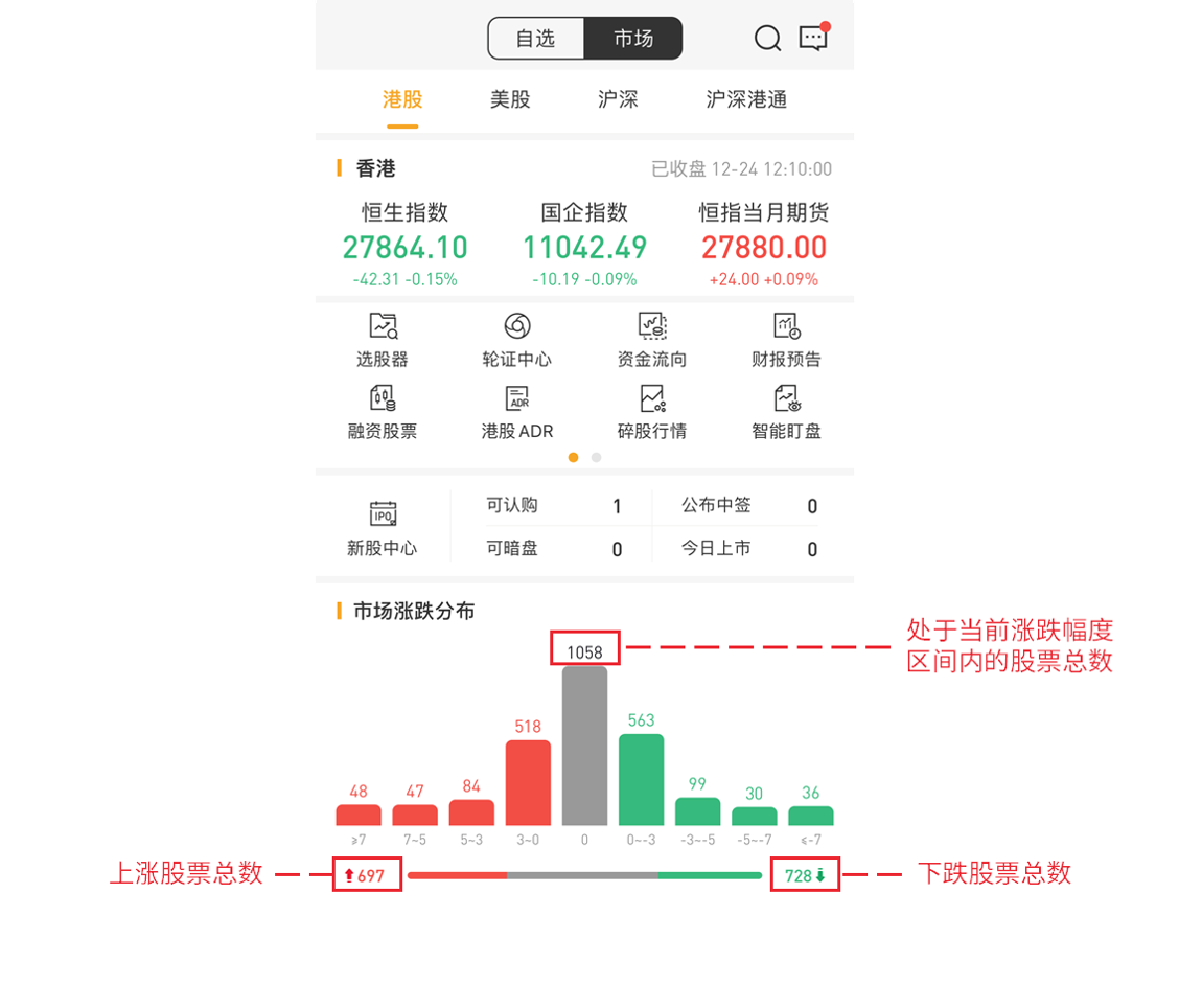 第三,是市场涨跌分布,这一块区域的图列举了当前市场所有股票的涨跌分布,可以让我们侧面知晓市场涨跌的总体情况。比如下图告诉我们,超过7%涨幅的香港市场股票有48支,整个港股市场上涨股票有697支。