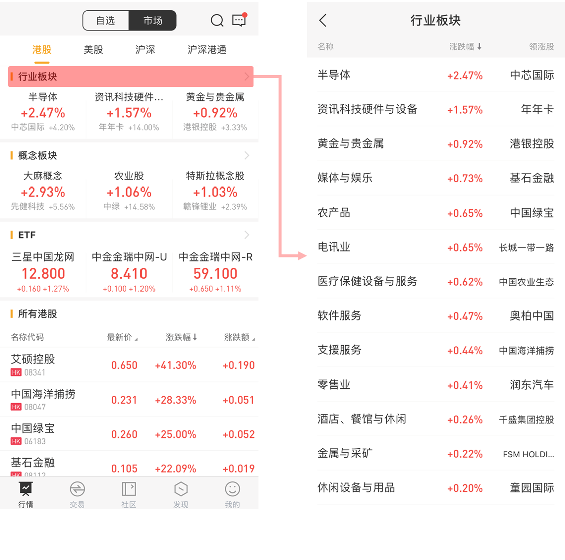 第四,华盛通将市场中的股票根据行业板块和概念板块进行了归类,如果自身有偏好某个板块或者某个概念,可以找到对应的集合就能查询到同纬度下的所有股票进行查看,快速找到相似的目标股票。