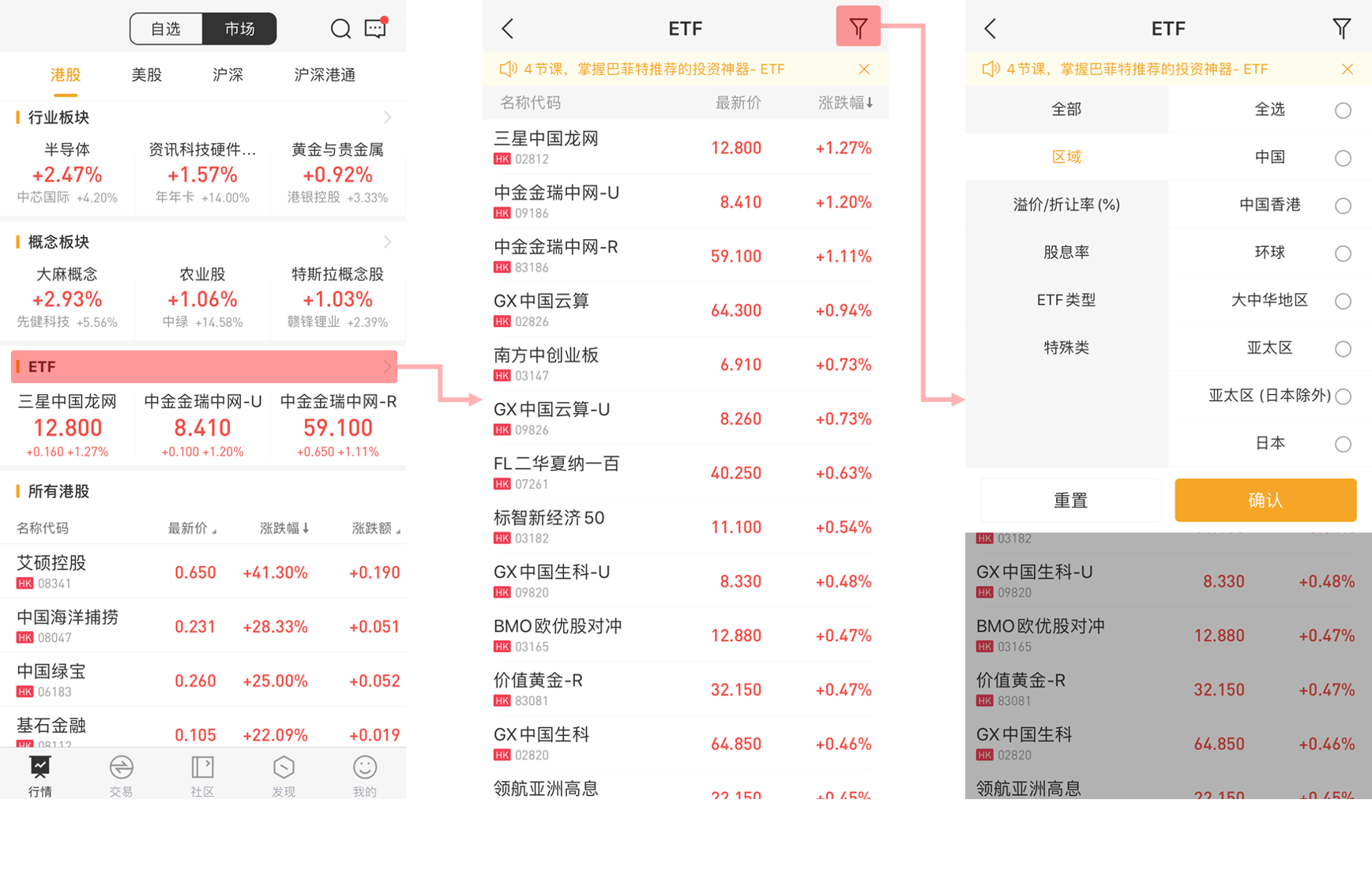 第五,是市场中的ETF标的,若是对ETF投资有兴趣的投资者可以在这里进行查询,并且配备了筛选功能,通过不同维度的偏好快速找到自己的心仪标的。