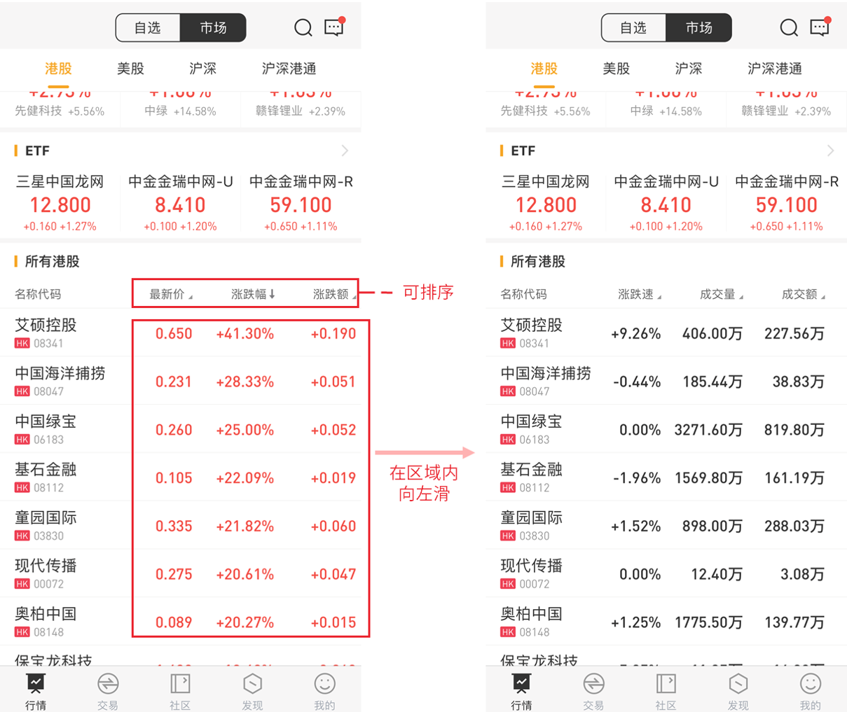 最后,则是当前市场所有股票列表,同时还展示出股票的最新价、涨跌幅、涨跌额等不同维度指标,点击即可排序,让我们可以快速根据某个指标找到倾向股票。