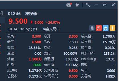 德视佳暗盘高开13.33% ,截止16:15,暗盘段报9.5港元,较发行价港元涨26.67%,暂成交15.7万港元,最新总市值 30.14亿港元。