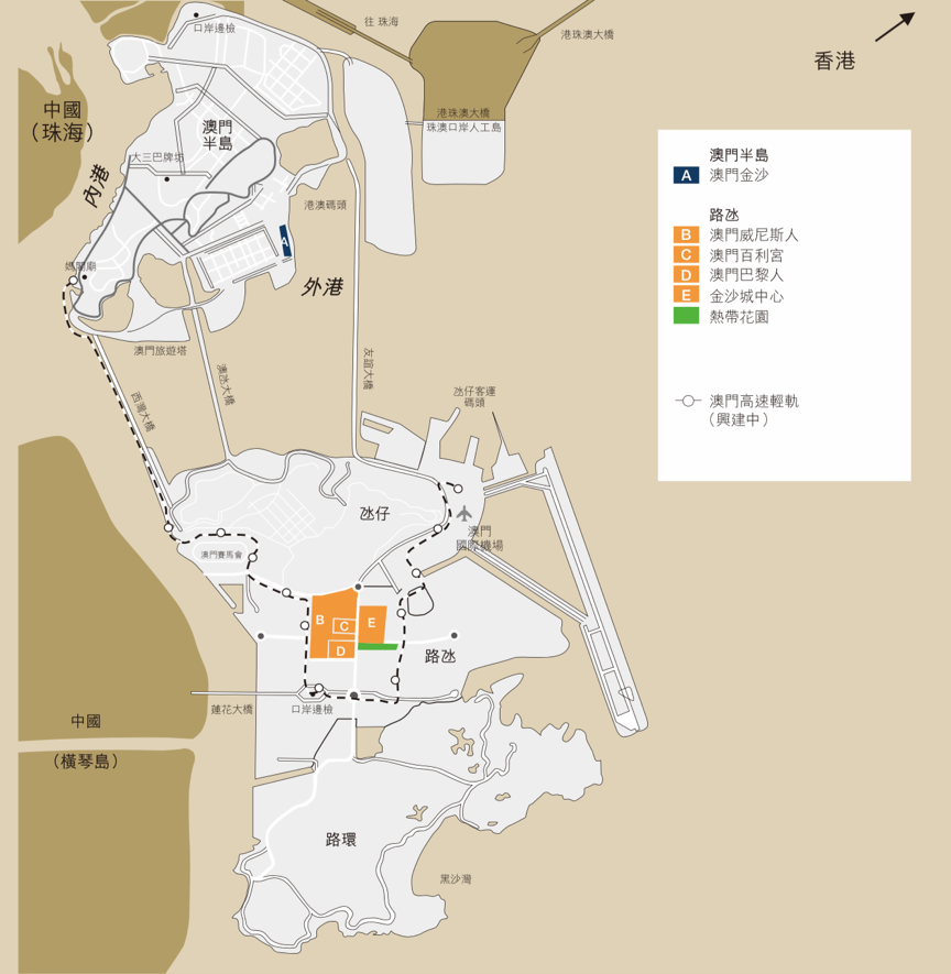 金沙中国的核心业务包括澳门威尼斯人、金沙城中心、澳门巴黎人、澳门百利宫以及澳门金沙的运营,此外还涵盖上述物业的配套设施,例如往来香港与澳门的高速轮渡服务。