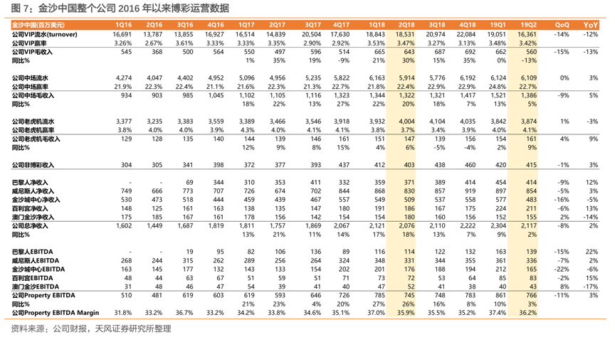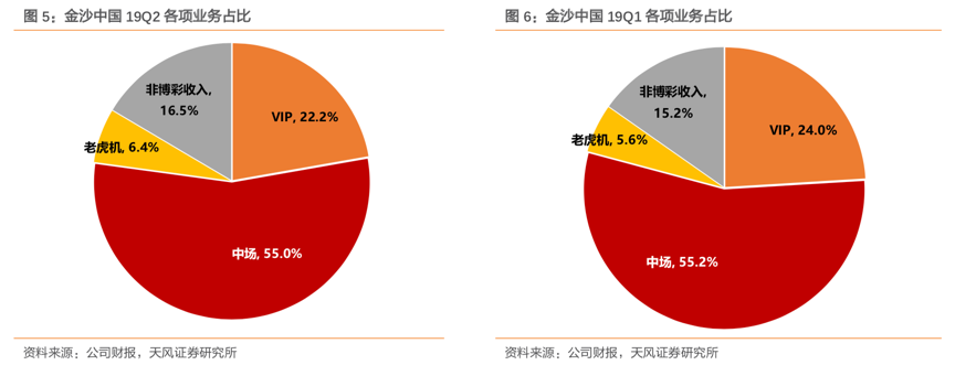 金沙中国的经营战略,旨在建立一个大规模综合度假村,并借助旅游、零售、知名酒店(四季、喜来登等)、文娱设施和餐饮来吸引不同地区的目标群体造访,并最终贡献收入。从收入角度看,金沙中国的核心仍是博彩收入,2019年Q1及Q2,博彩收入占公司总收入比例超过80%,其中中场(赌台、角子机)带来的收入最高。