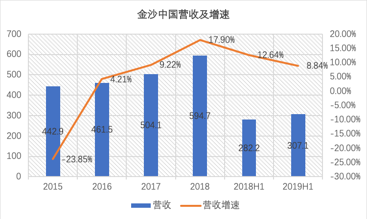 金沙中国的营收曾在2015年经历过一次较大的滑坡,当年营收增速为-23.85%。2016之后,金沙中国重新回到增长路线中,并在2018年创下294.7亿元的营收新高。此外,2019年上半年,金沙中国继续保持正增长,营收达307.1亿元,同比增长8.84%,但较去年同期12.64的增速有所放缓。