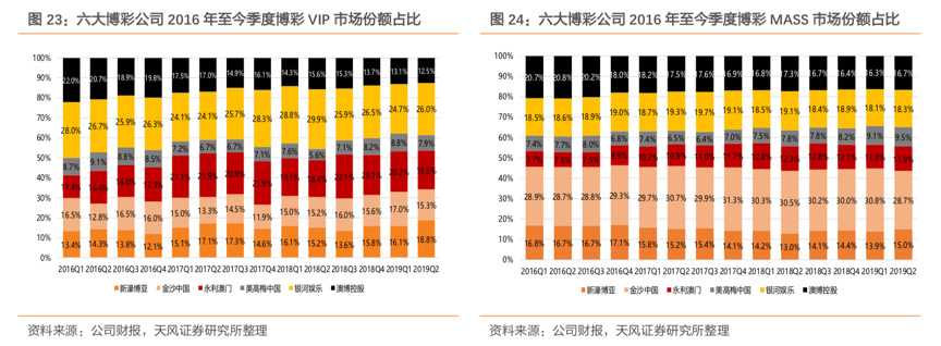 博彩公司的核心分部——VIP、MASS(中场)的市场份额长期保持稳定。其中,金沙中国在中场业务市场的份额占比保持行业领先地位,其30%左右的中场份额在业内排名第一。VIP业务方面,近年来永利澳门的市场份额有所扩张而澳博控股份额有所下降,金沙中国(市场份额在15%上下波动)及其他博彩公司份额几乎维持不变。