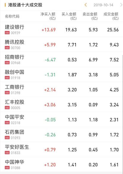 港股通资金今日净流入港股37.66亿元。港股通今日净买入建行13.69亿港元,腾讯5.99亿港元,汇丰控股3.06亿港元。