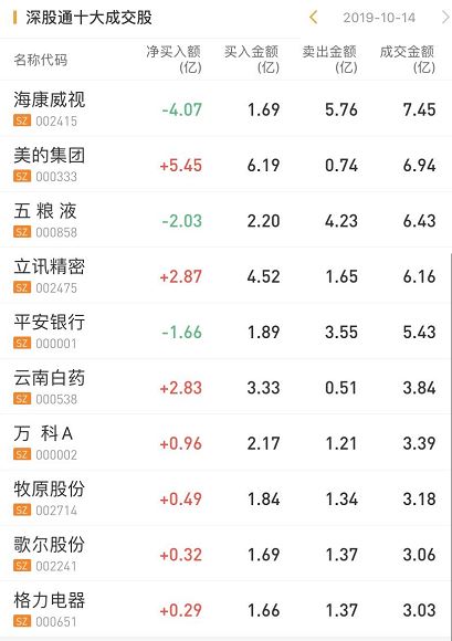深股通净买入美的集团5.45亿,净买入立讯精密2.87亿;净卖出海康威视4.07亿。