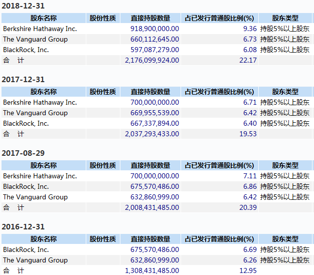 美银为巴菲特旗下伯克希尔投资组合中的第二大持仓标的,仅次于苹果,市值约270亿美元。2017年第三季度,美银占其投资组合的9.68个百分点,之后比例增加了2.71个百分点。近年来,美银的前几大机构投资者还包括巨头先锋集团(Vanguard Group)及贝莱德集团(BlackRock)。