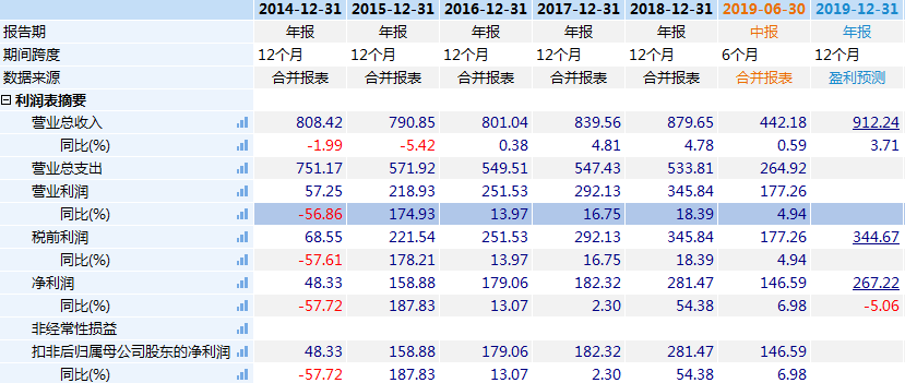从盈利角度,成本提升需要匹配收入增速才能取得好成绩,受宏观市场影响,近5年来公司营业利润增速从两位数跌至19年半年报的低点(4.94%), 19年净利润预计将首次出现自15年以来的负增长,19年中报扣非归母净利润同比增长6.8%,相比之下18年全年同比增速高达54.38%。