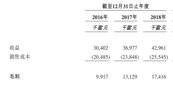公司2016财年至2018财年总收益分别为3040.2万欧元、3697.7万欧元及4296.1万欧元,年复合增长率18.9%,净利润分别为193.9万欧元、857.1万欧元及429.1万欧元,年复合增长率为48.8%。