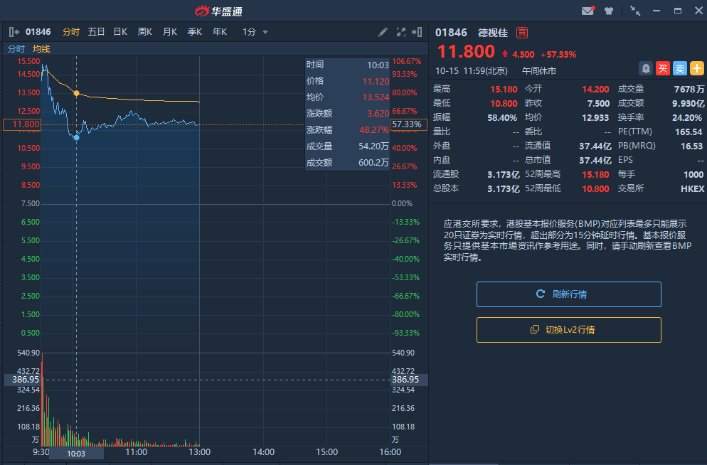 前几天,鲁大师(03601.HK)与鑫苑服务(01895.HK)上市后暴涨成为了港股市场的焦点,同时也吸引了不少内地投资者的关注。今天上市的德视佳(01846,HK)开盘最高涨至15.18港元,涨幅102.4%,昨日暗盘收报12.88港元,较发行价7.50港元涨71.73%,每手5380赚港元。德视佳后市会怎么走?让人有无限的遐想。