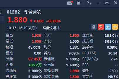 华营建筑暗盘高开50% ,截止16:19,暗盘段报1.88港元,较发行价港元涨88%,暂成交363万港元,最新总市值 9.40亿港元。