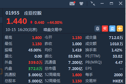 庄臣控股暗盘高开15% ,截止16:21,暗盘段报1.44港元,较发行价港元涨44%,暂成交1010万港元,最新总市值 7.2亿港元。