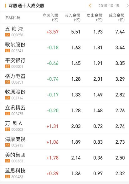 深股通净买入五粮液3.57亿、万科A1.31亿,净买入美的集团1.78亿。