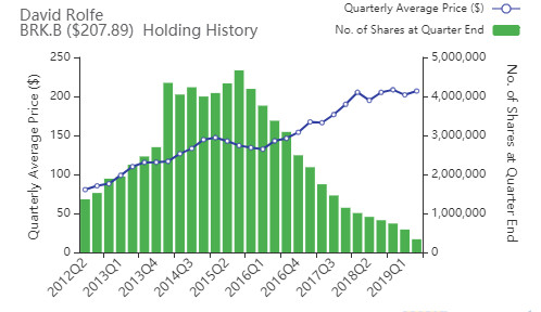 罗尔夫已经持有伯克希尔股票数十年之久,他在最近致股东的信上表示在过去几个季度不断减仓以后,由于对巴菲特错过当前十年牛市的不满,已经决定完全清仓该股票。根据SEC数据,截止2019年第二季度Wedgewood持有337406股伯克希尔B类股票,占该基金的股票投资总额6.09%。