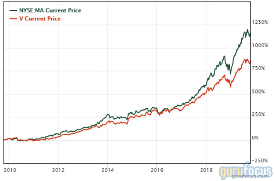 根据数据显示,伯克希尔目前同时持有万事达卡和维萨公司的股票,只是它们占总投资额的比重很低。在过去十年里,万事达卡股价已经飙升了超过1800%,而维萨公司也有超750%的涨幅。