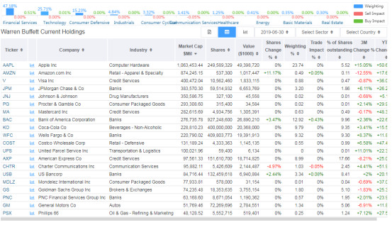 截止2019年2季度,伯克希尔持有9.27亿股美国银行,持仓比例在10%左右。从总的持仓结构来看,伯克希尔47.18%的仓位都在金融股上,市值近1000亿美元,前十大持仓中有六家是金融公司。
