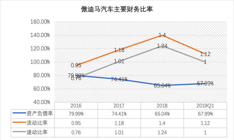财务比率数据显示傲迪玛汽车是一家偏向重资产运营的企业。公司资产负债率长期维持在65%以上,流动比率、速动比率在1附近,在行业内属于平均水平,不算特别优秀,但在经营上亦并不存在较大的风险。