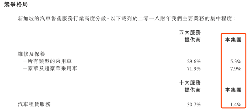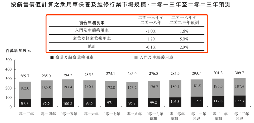 行业规模和前景方面,受全球汽车行业景气度下行影响,新加坡汽车售后服务行业增长有限。根据招股书,随着新加坡的老龄乘用车数量增加,乘用车保养及维修行业的市场规模预期年复合增长率为2.9%,其中豪华及超豪华乘用车分部的预计增速年复合增长率为5%。考虑到全球汽车行业景气度下行,新加坡的汽修售后市场的表现算是差强人意,但明显不属于高速成长赛道。