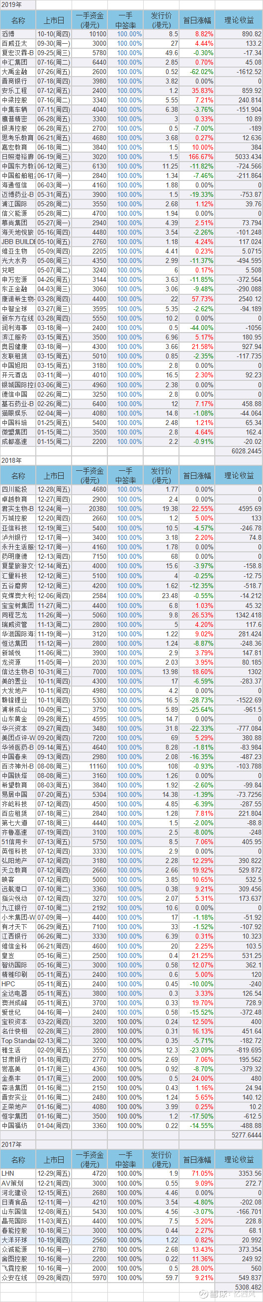先说明一下,香港新股的中签率很高,申购一手的中签率动不动就100%,但是也有很热门的新股,中签率就很低了,所以我的统计数据有2个思路:(1)统计所有中签率100%的新股,以上市首日的收盘价卖出,统计收益。(2)根据中签率、上市首日收盘价,统计所有新股的理论收益,即理论收益=一手资金*中签率*首日涨幅。