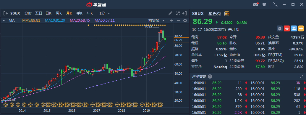 在一年多之前,星巴克 (SBUX)的股价还是和2015年中期时候一样在50美元区间中段波动,三年内股价没什么大波澜;但从去年6月份开始,星巴克股价开始大幅上升,累计涨幅超过50%。