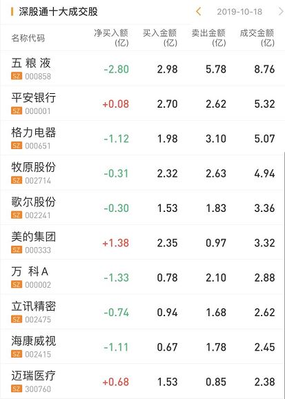 深股通净卖出五粮液2.80亿、万科A1.33亿,净买入美的集团1.38亿。