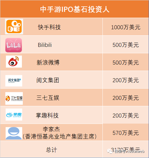 包括快手科技、Bilibili、微博、阅文集团、三七互娱、掌趣科技。另外,香港恒基兆业地产集团主席李家杰也将成为中手游基石投资人中的重要一员。上述七家基石投资人投资额合计约2.5亿港元。