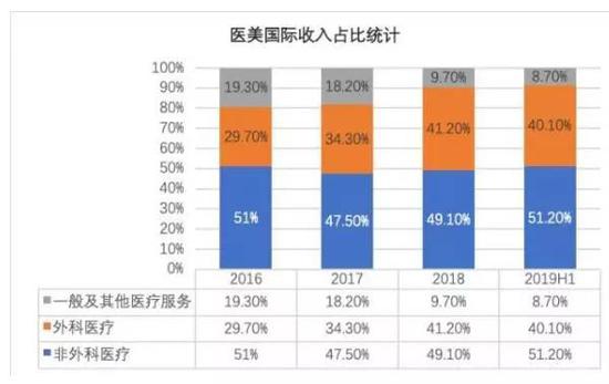 根据财务数据显示,2016、2017、2018以及2019年上半年,医美国际的营业收入分别为5.84、6.97、7.61、3.93亿元,2016-2018期间营收年复合增长率为14.15%。在收入来源方面,外科美容治疗服务、非手术美容治疗服务、以及一般医疗保健和其他美容服务在内的三大医疗服务。从下图的三个业务的占比来看,美容治疗服务收入是医美国际的收入顶梁柱。