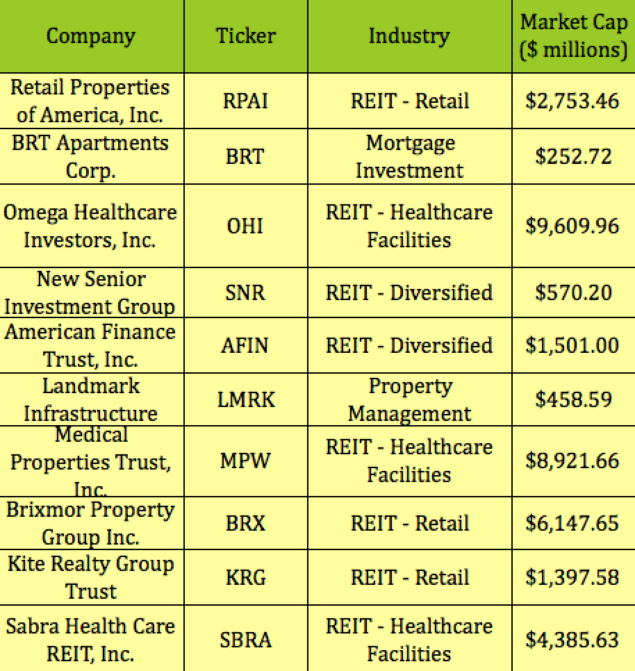 These are the companies which comprise this Top 10. It's a mixed group of small and mid-cap firms, mostly REIT's of many flavors, involved in Healthcare, Retail, Residential, and Diversified real estate holdings:
