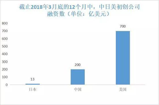 而近几年也没有改善。有数据显示,在截止2018年3月底的12个月中,日本初创公司从风投机构融得的资金仅为13亿美元,而与之对应,美国和中国初创公司分别融得的700亿美元和200亿美元。