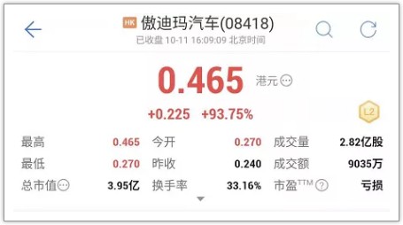 傲迪玛汽车首日上市大涨93.75%至0.465港元