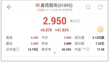 鑫苑服务首日上市大涨41.83%至2.950港元