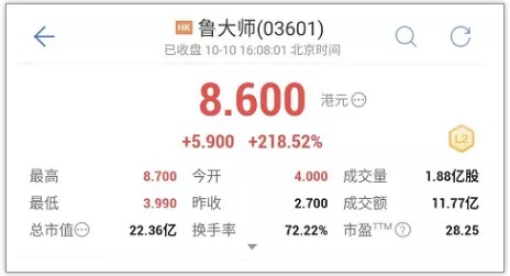 鲁大师上市首日盘中一度暴涨222%至8.7港元,最终收涨218.52%,报8.6港元,市值22.36亿港元。