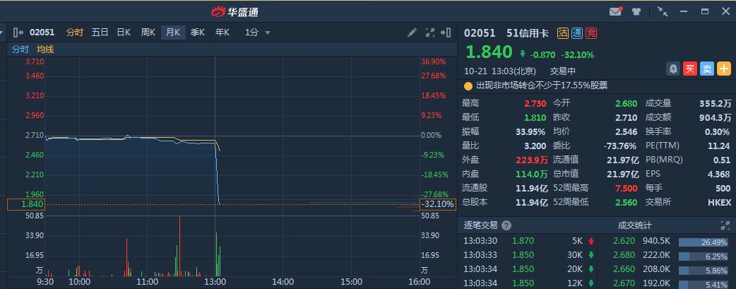 51信用卡(2051.HK)午后跳水大跌超30%,报1.84港元,创上市新低,最新总市值21.97亿港元。有突发消息称,今天上午51信用卡管家遭浙江警方调查,现场警车云集。网传有一百多名警察冲进51信用卡在西溪的办公大楼。